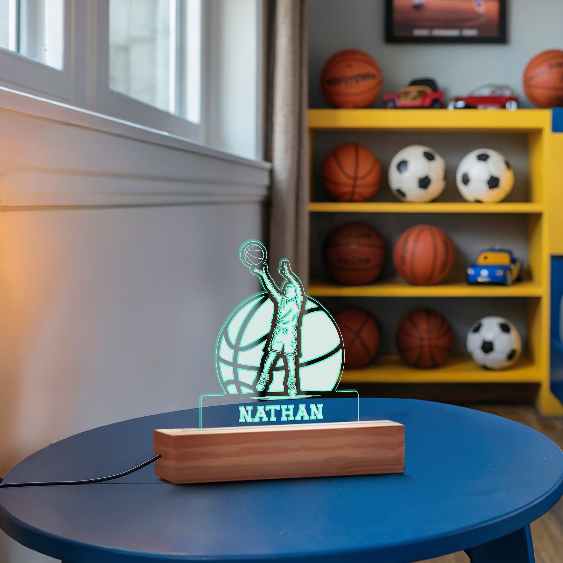 Light up the game with a custom Basketball Shooter Nightlight! This vibrant LED nightlight is the winning accessory for any athlete's or fan's room. Customizable with a name, this engraved basketball lamp showcases a dynamic point guard design, shining in soft, eye-catching colors. It’s the perfect custom sports decor and a thoughtful, personalized gift for kids or teens.