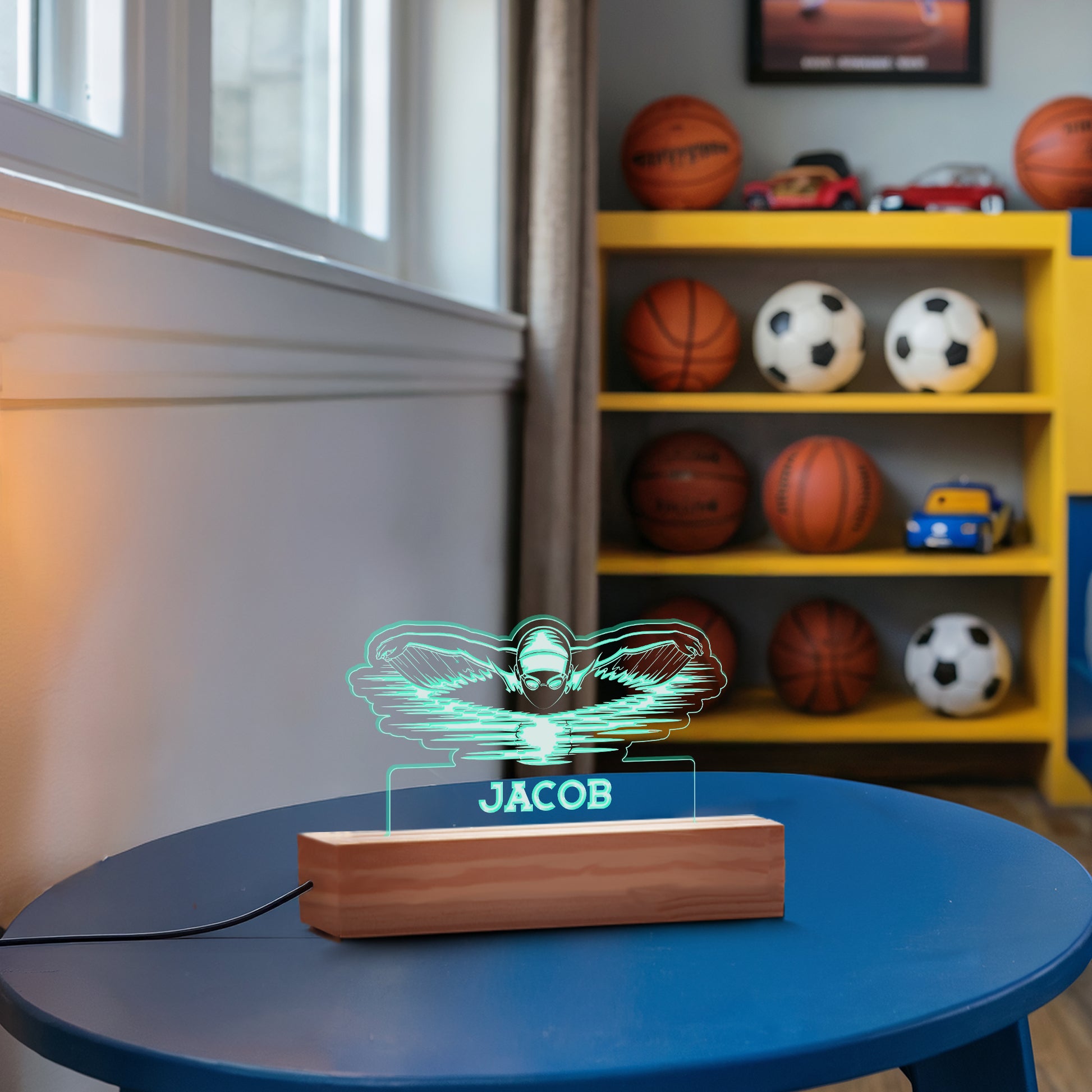 Ready to make a splash? Get the custom Swimming Nightlight that turns their bedroom into their very own lane, making sure they're energized for the morning practice!